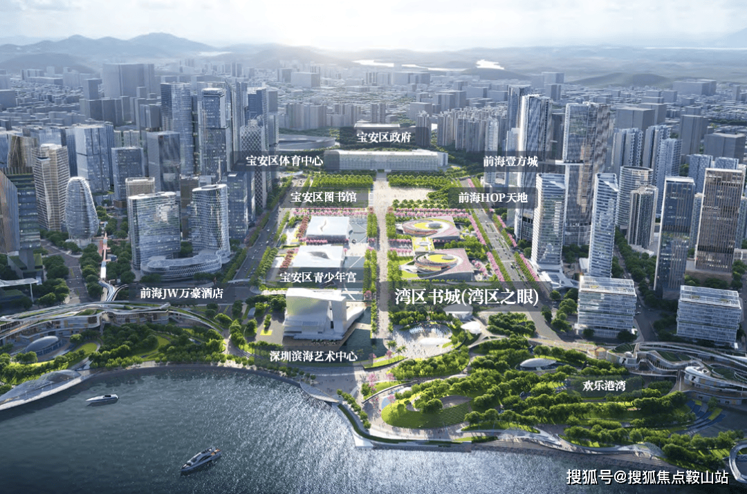 “湾区之眼”位于前海城市新中心与宝安中心区滨海绿轴东侧,直连深圳地铁5号线万平方米的“双玉盘”建筑形态自然融入滨海绿轴。