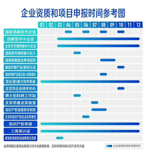 如果您错过了本次赋能特派团政策专场也无妨,还有一份产业服务礼物等待您的查收!首钢园企服驿站特根据过往年份企业资质和项目申报时间经验,为园区企业整理汇总申报时间导引,帮您提前布局,精准谋划,敬请持续关注。